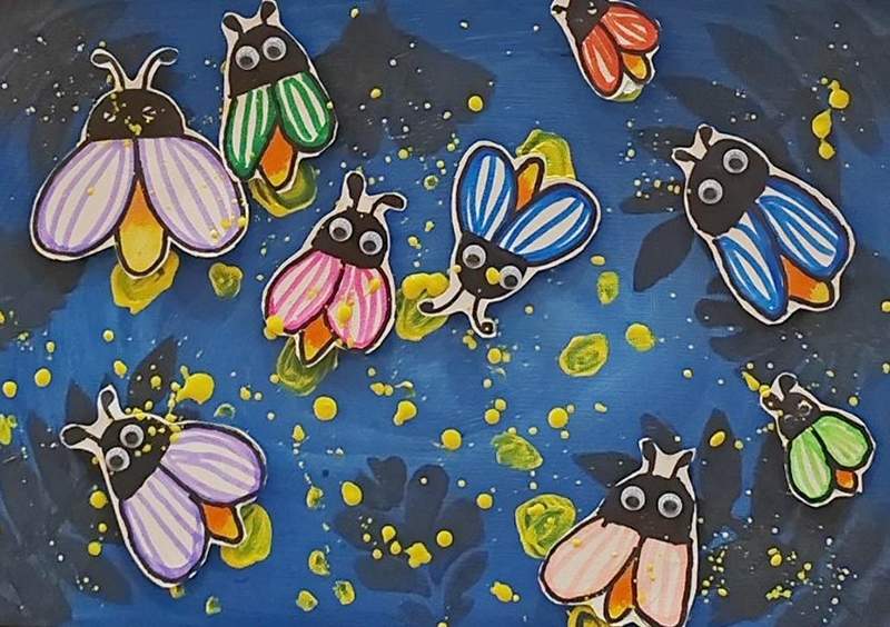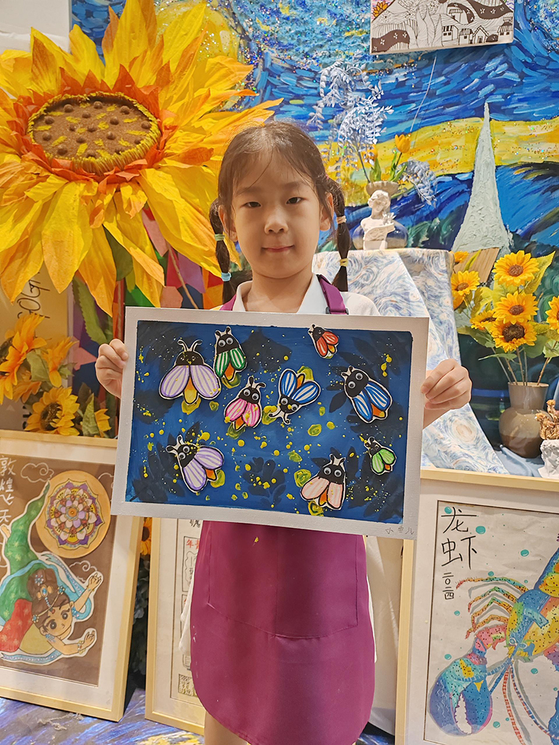 傅允恩:5歲 畫齡:6個月 作品名稱:《夏夜里的螢火蟲》 指導(dǎo)老師:李滄星光大道教學(xué)基地——王婷