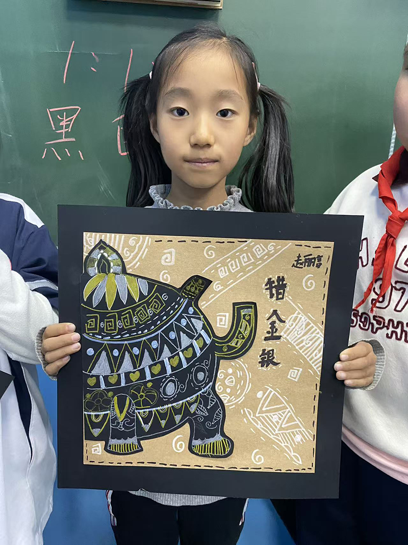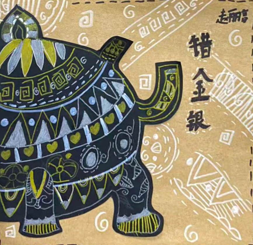 趙麗言:7歲 畫齡:14個(gè)月 作品名稱:《錯(cuò)金器物》 指導(dǎo)老師:膠南維客教學(xué)基地——王甜甜