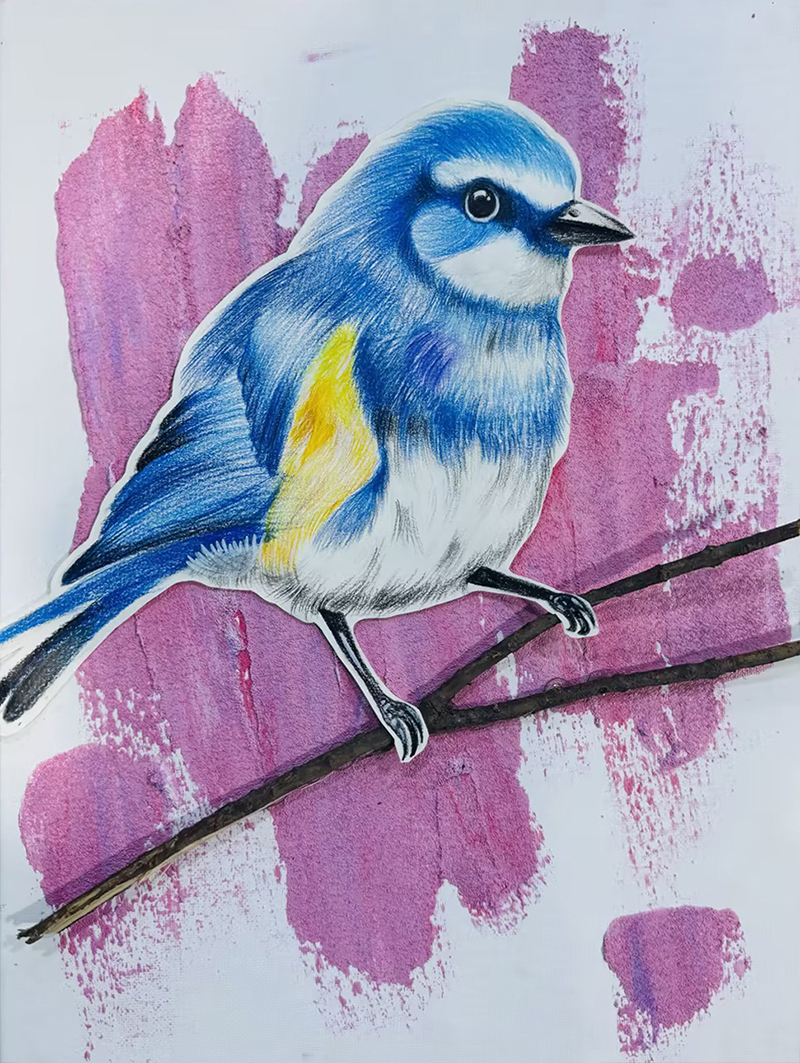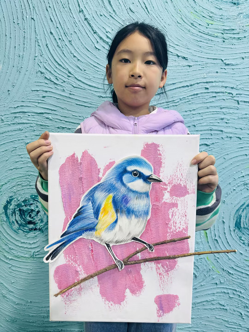 梁越然:10歲 畫齡:2年半 作品名稱:《石英砂和小鳥》 指導教師:黃島中聯(lián)教學基地——王雪