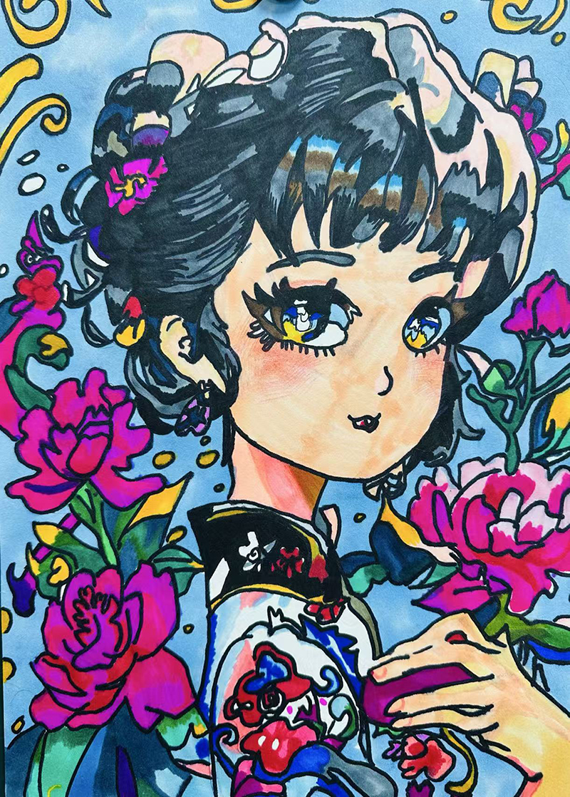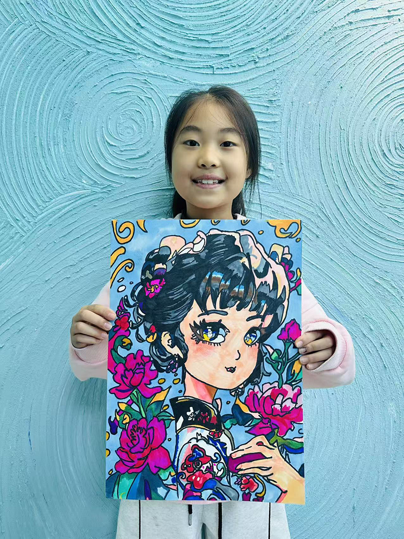 肖晰宸:9歲 畫齡:6個(gè)月 作品名稱:《簪花辭》 指導(dǎo)老師:黃島官?gòu)d教學(xué)基地——李金潼