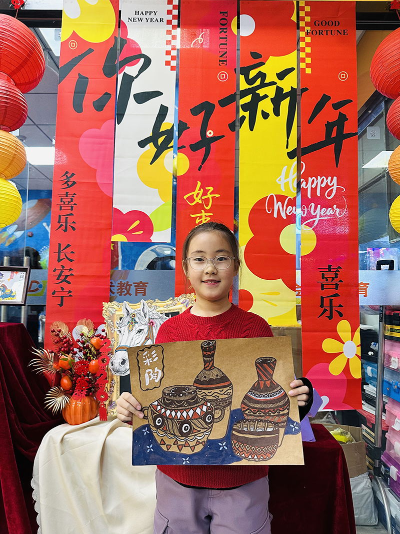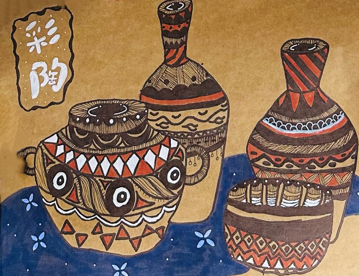 馬千茵:7歲 畫齡:1年 作品名稱:《彩陶文化》 指導老師:黃島官廳教學基地——李金潼