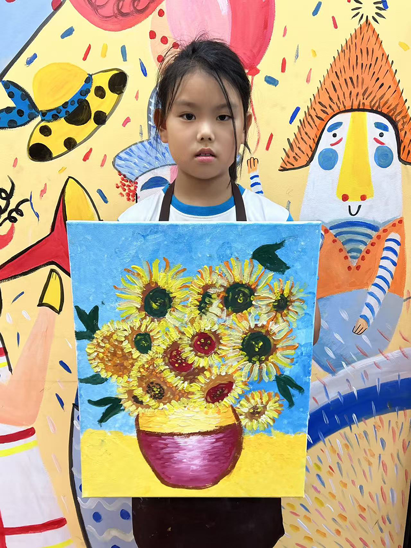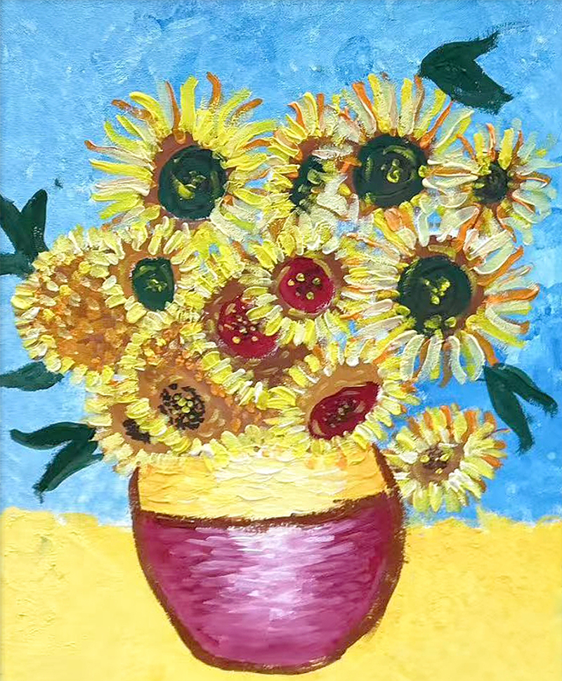 紀(jì)云溪:8歲 畫齡:1年 作品名稱:《梵高的向日葵》 指導(dǎo)老師:膠南維客教學(xué)基地——盧鈺