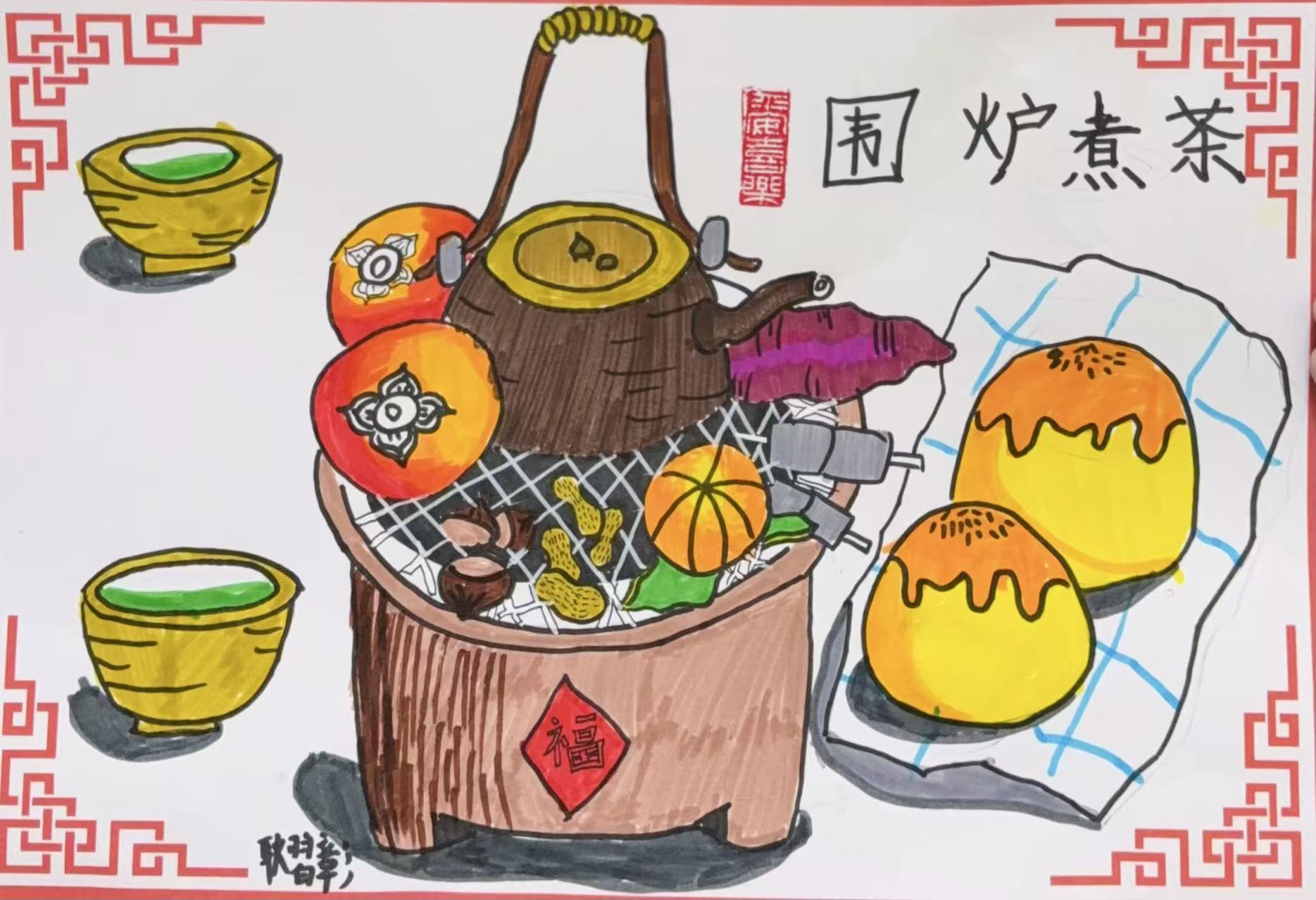 耿習(xí)彰:8歲 畫齡:4年 作品名稱:《圍爐煮茶》 指導(dǎo)老師:黃島官?gòu)d教學(xué)基地——張曉琪