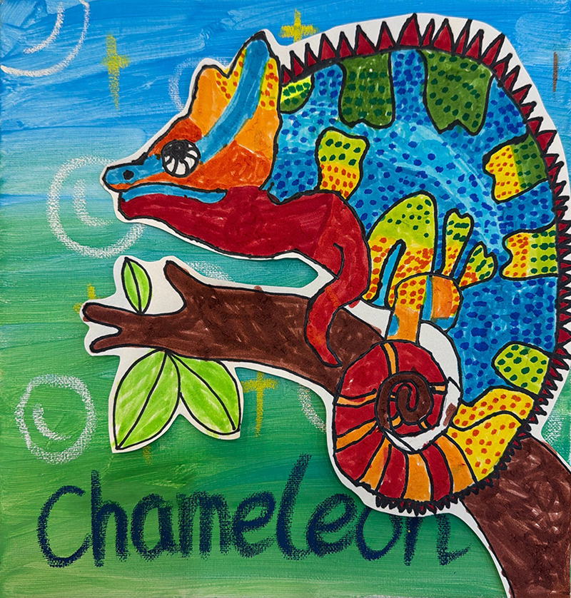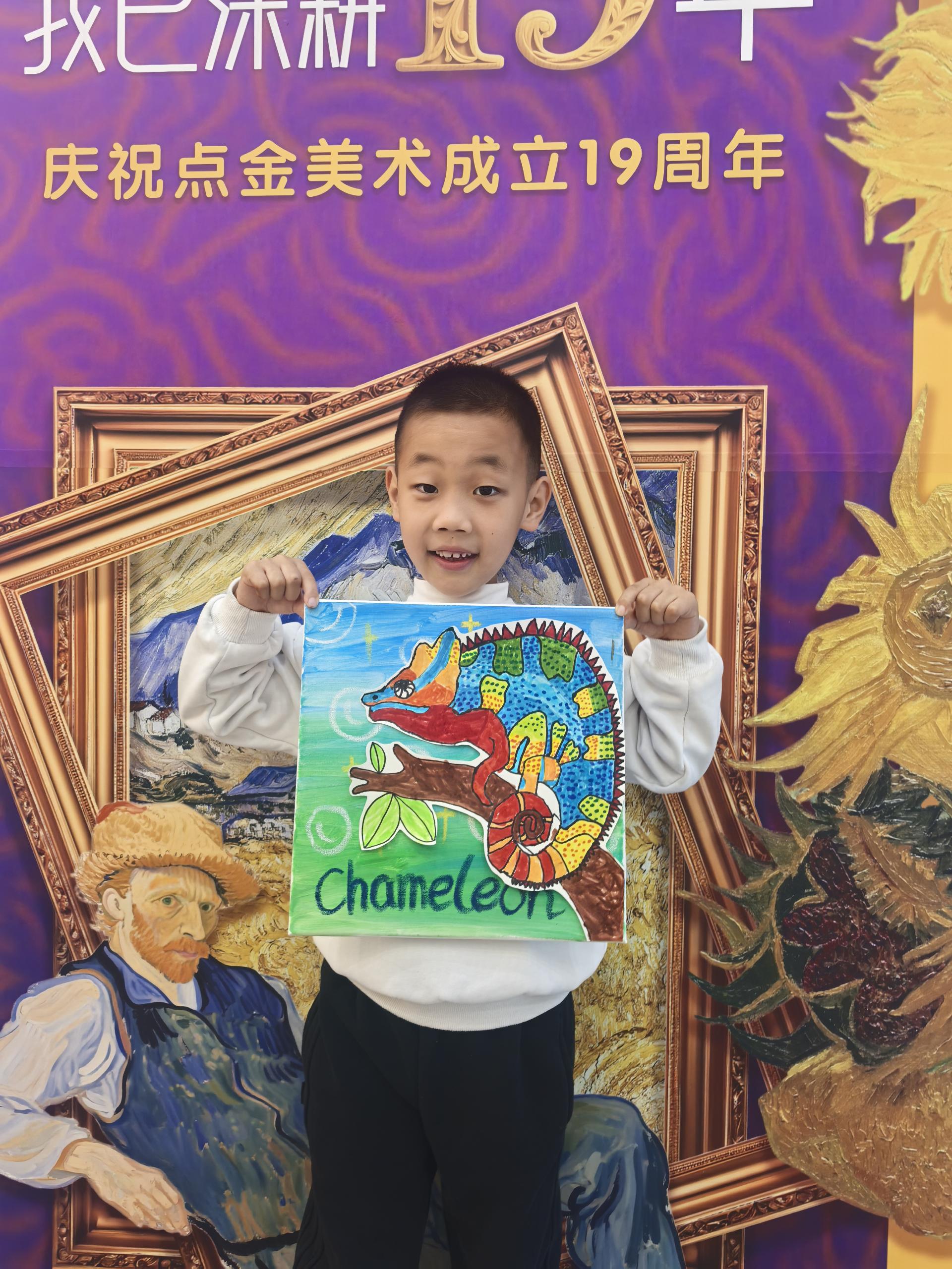 王子平:7歲 畫齡:1年 作品名稱:《變色龍》 指導(dǎo)老師:嶗山大拇指教學(xué)基地——陳清瀅