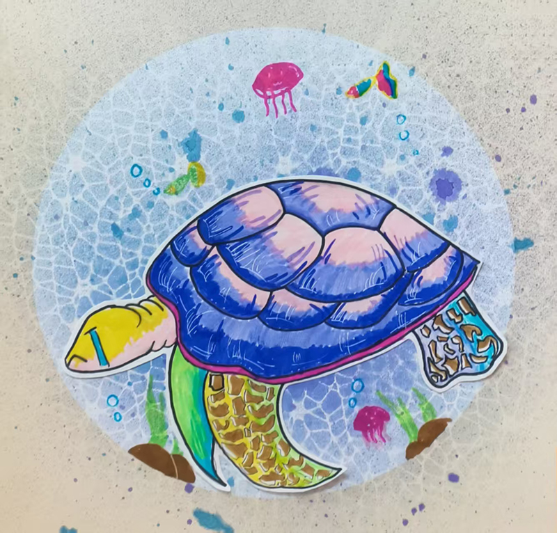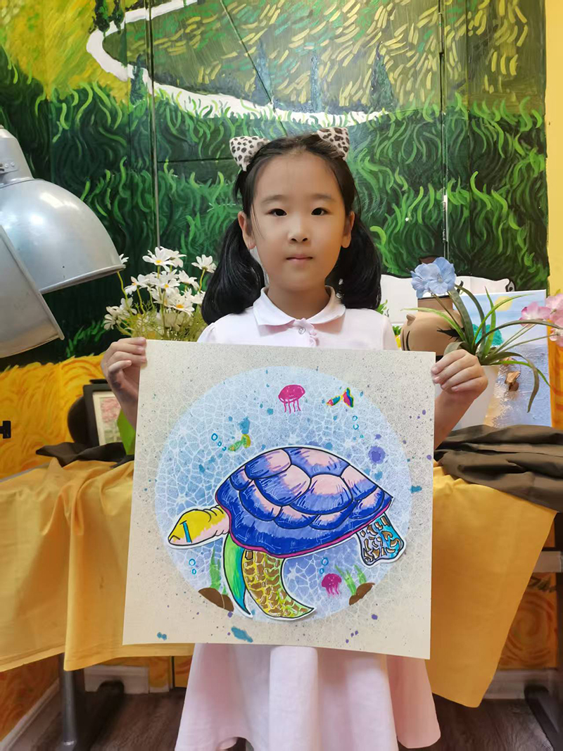 孫藝銘:7歲 畫齡:2年 作品名稱:《海龜》 指導(dǎo)老師:黃島官?gòu)d教學(xué)基地——龔麗鑒