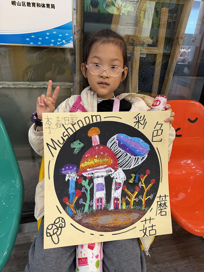 李嘉曈:6歲 畫齡:1年 作品名稱:《彩蘑菇》 指導(dǎo)老師:嶗山大拇指教學(xué)基地——趙蕾