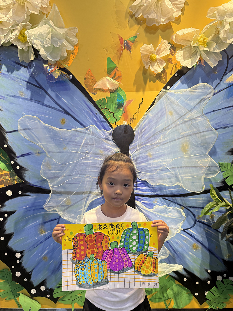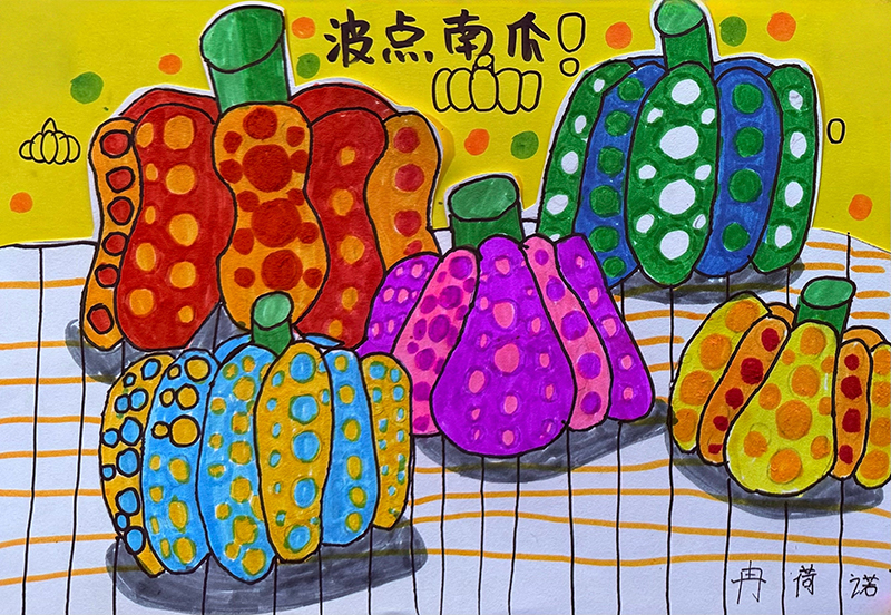 冉荷諾:6歲 畫(huà)齡:6個(gè)月 作品名稱(chēng):《波點(diǎn)南瓜》 指導(dǎo)教師:黃島中聯(lián)教學(xué)基地——唐雯