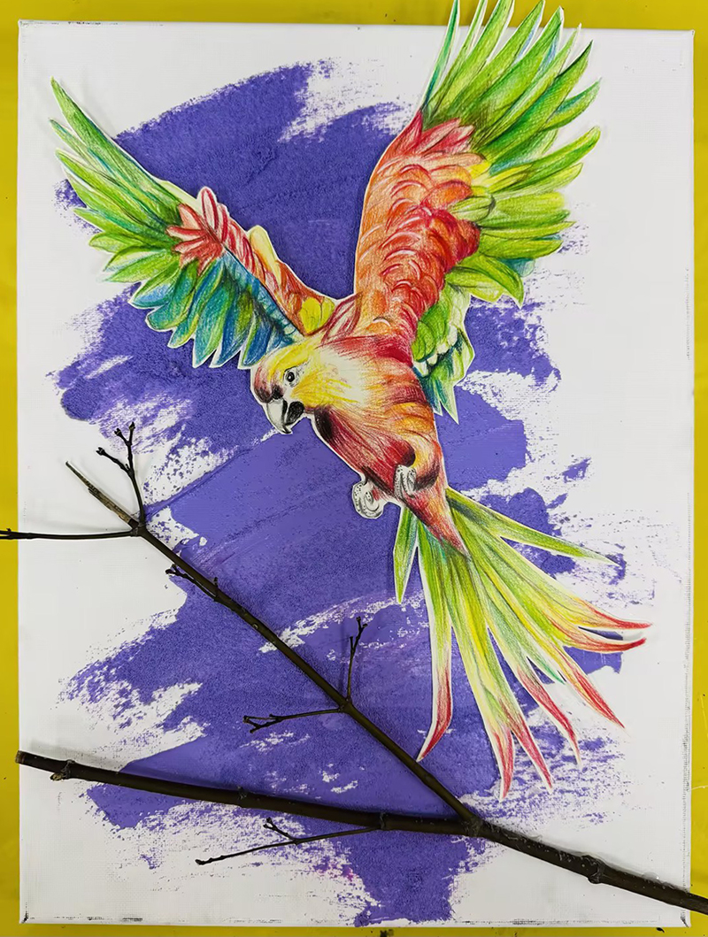王若兮:12歲 畫齡:5年 作品名稱:《飛鳥》 指導(dǎo)老師:黃島中聯(lián)教學(xué)基地——王雪