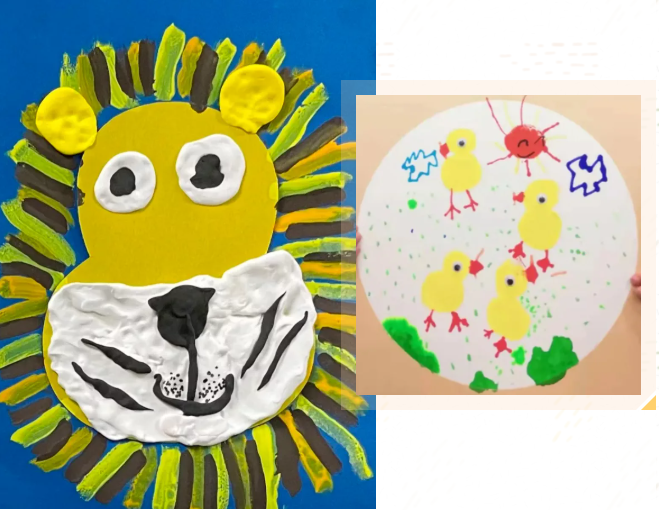利用不同材料拼貼的小獅子,立體、生動(dòng)、可愛(ài);還有正在散步的小雞,雖然小學(xué)員的筆法不嫻熟,但是我們能從畫(huà)面中看出他們對(duì)小動(dòng)物的喜愛(ài)。
