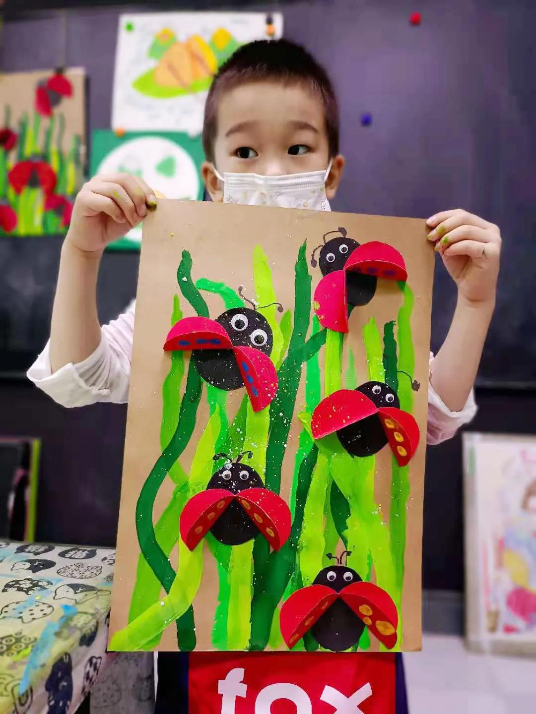 啟蒙、啟發(fā),讓孩子們意識(shí)到藝術(shù)就存在于生活中,無(wú)處不在,一個(gè)小小的圓形就可以制作出一只只瓢蟲(chóng),小昆蟲(chóng)也是他們觀(guān)察的對(duì)象。