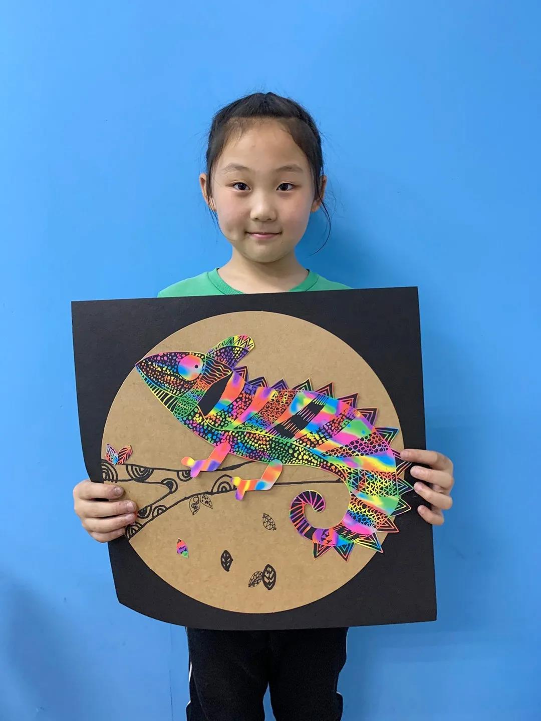 動(dòng)物之中當(dāng)然也有爬行類(lèi)動(dòng)物的身影,變色龍也是小學(xué)員們觀(guān)察繪畫(huà)的對(duì)象,拼貼、線(xiàn)描等等一系列的創(chuàng)作手法集于一幅畫(huà)中,增加了立體感。