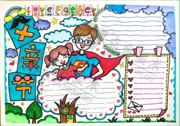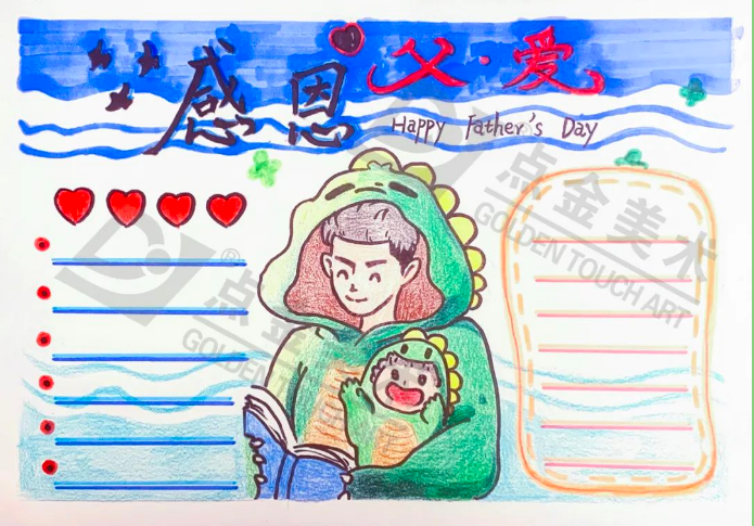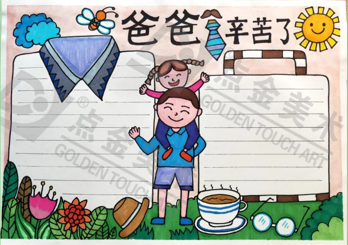 在這個(gè)特殊的節(jié)日里,點(diǎn)金美術(shù)的老師們?yōu)樾W(xué)員們準(zhǔn)備了原創(chuàng)的手抄報(bào)模板,小學(xué)員們可以根據(jù)自己的需要,進(jìn)行排版和組合,還可以將現(xiàn)有的元素制作成賀卡的模式,送給自己的爸爸吧~