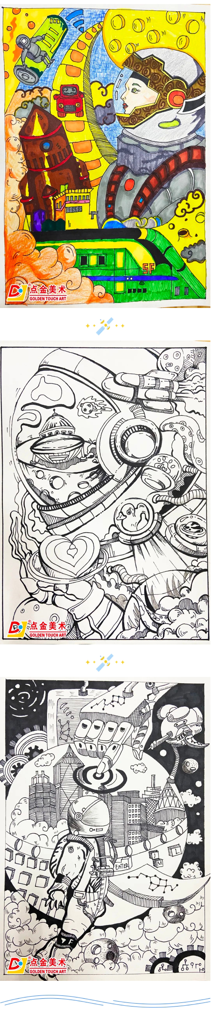 在這個時候,點金美術(shù)的老師們也準備了很多與航天相關(guān)的主題畫,小學員們可以結(jié)合主題畫內(nèi)容進行再次創(chuàng)作,完成一幅精美的以航天為主題的作品,向偉大的航天英雄致敬。