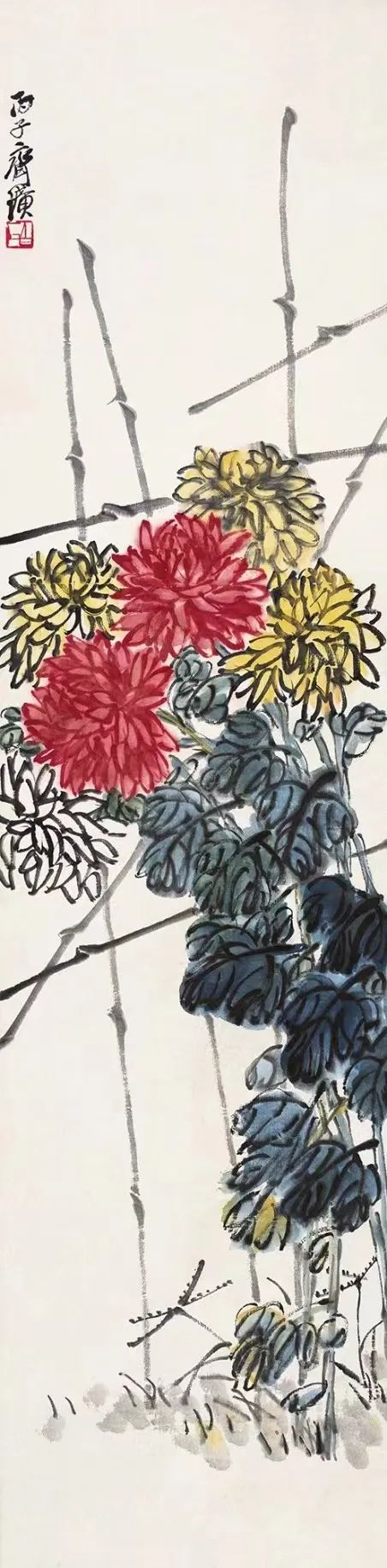 據(jù)記載,他曾聽從陳師曾的建議,將菊花繪成紅色,葉子畫為黑色,成功實(shí)現(xiàn)“衰年變法”。