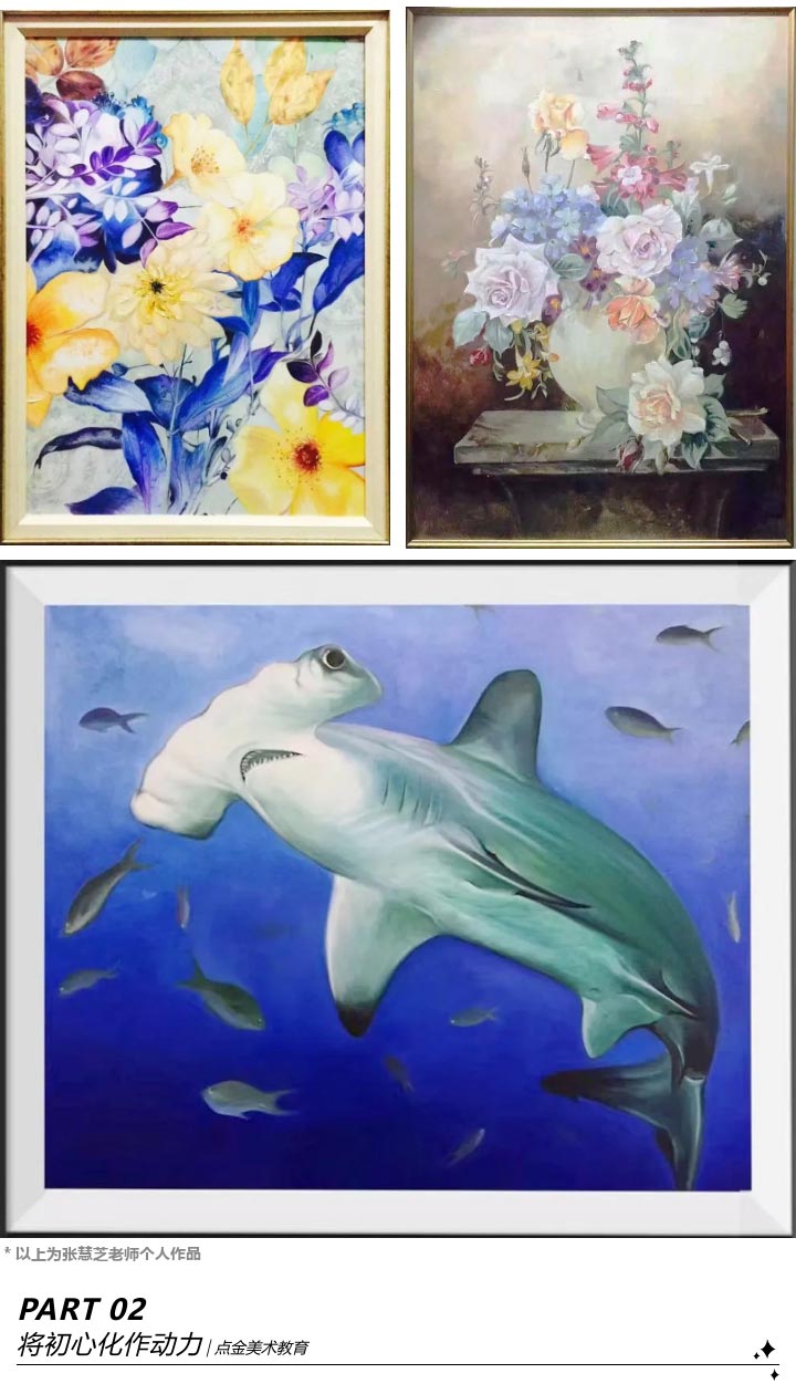 當(dāng)張慧芝老師在空閑時細(xì)細(xì)品味加入點金的這七年時,不禁感慨,“點金美術(shù)給了我展現(xiàn)自我的機(jī)會,從懵懵懂懂到游刃有余,我不斷學(xué)習(xí),努力成長。面對來自工作和生活中的各種挑戰(zhàn),終身學(xué)習(xí)是一種要求,更是一種原則,知識日新月異的時代,我將終身學(xué)習(xí)內(nèi)化成自己的一種自覺行為,不斷學(xué)習(xí),提高自己。”