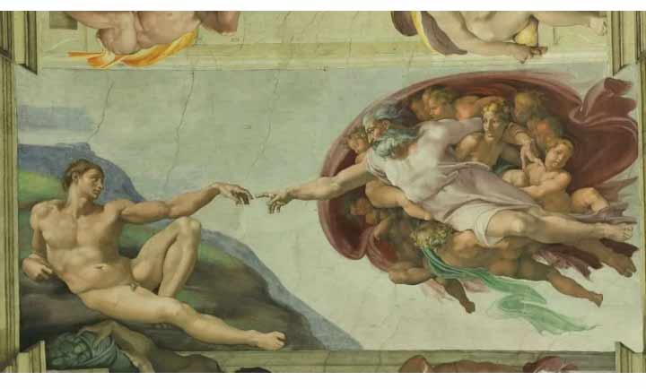 其中《創(chuàng)造亞當(dāng)》是整個(gè)天頂畫中最動(dòng)人心弦的一幕,這一幕沒有直接畫上帝塑造亞當(dāng),而是畫出神圣的火花即將觸及亞當(dāng)這一瞬間:從天飛來的上帝,將手指伸向亞當(dāng),正要像接通電源一樣將靈魂傳遞給亞當(dāng)。