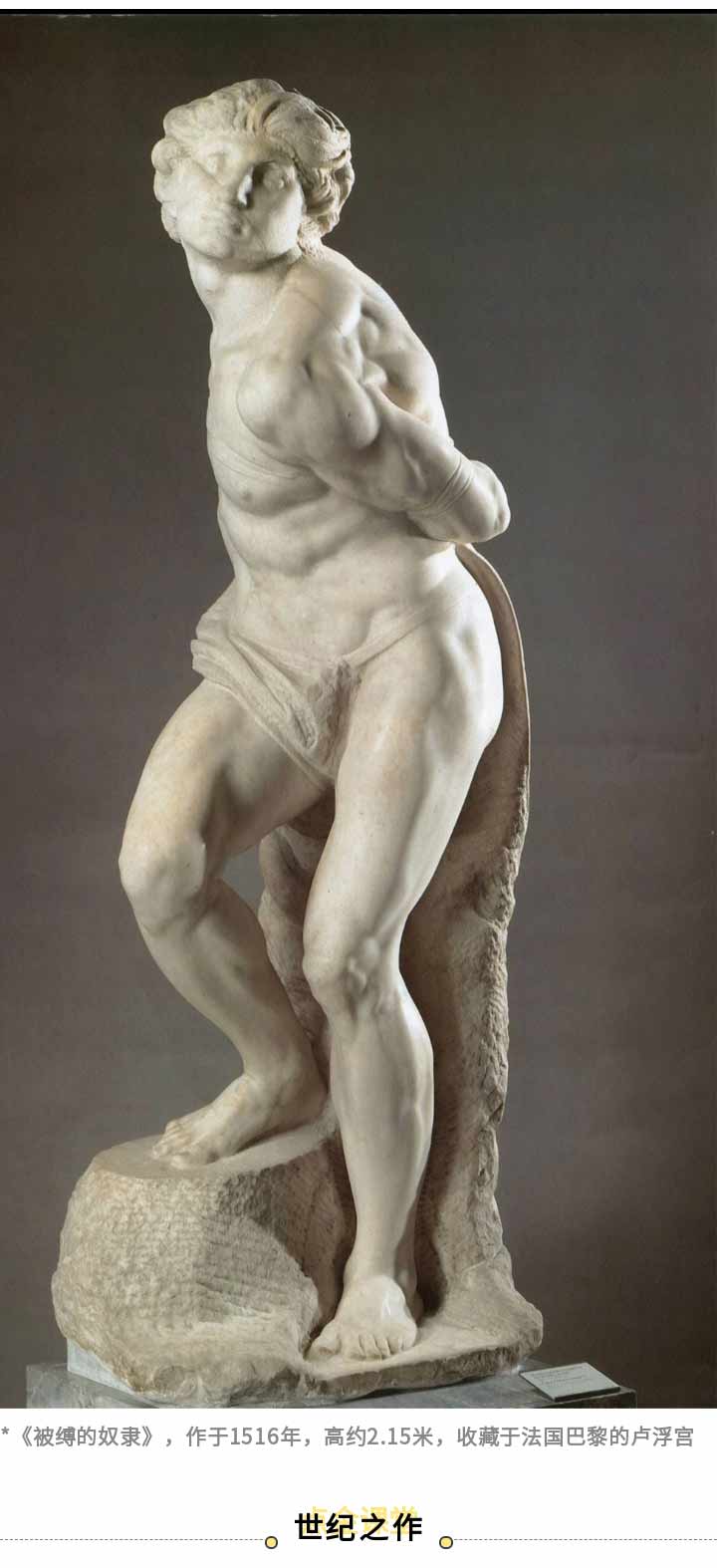 米開朗基羅不滿、憤怒、郁悶的情緒無處發(fā)泄,只能將這些負(fù)面情緒都寄托到了作品中。其中有兩件在1516年創(chuàng)作的奴隸雕塑是陵墓前最具有代表性的作品,即《被縛的奴隸》和《垂死的奴隸》。