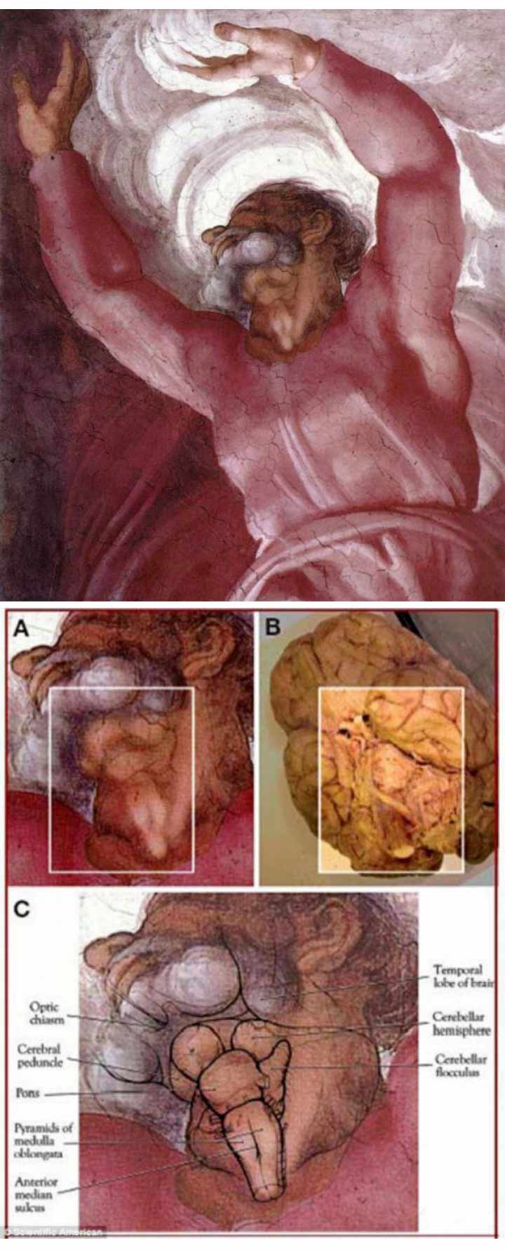 經(jīng)過對(duì)畫作研究之后,他們?cè)谝环菽X外科期刊《神經(jīng)外科》上發(fā)表文章說,在畫作最西邊的《神分光暗》部分隱藏了人類脊骨以及人腦神經(jīng)解剖圖的信息。
