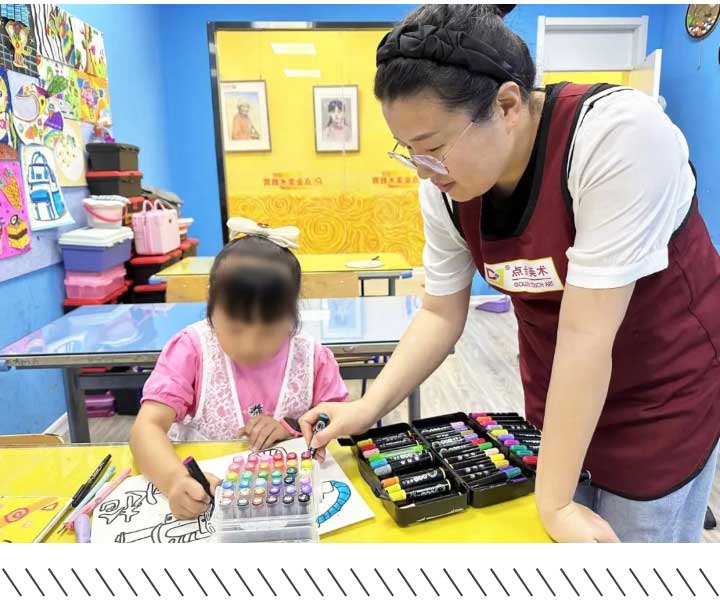 當(dāng)問到從教這些年孩子的變化時,李娜老師侃侃而談:“記得剛從業(yè)時,家長讓孩子學(xué)習(xí)美術(shù),說的最多的是,‘孩子特別喜歡畫畫,在家天天畫。我們也不會指導(dǎo),給她報個班學(xué)學(xué)吧?!菚r候家長只是單純的讓孩子學(xué)習(xí)畫畫,看重的是畫畫的本身,沒有考慮過畫畫對孩子各方面的影響與幫助?,F(xiàn)在越來越多的家長已經(jīng)了解認(rèn)識到,畫畫不僅僅是提高孩子的審美素養(yǎng),對于孩子專注力的培養(yǎng),觀察能力的訓(xùn)練,學(xué)習(xí)能力的提高都有很大的影響與幫助?!蔽覀兊拇_看到越來越多的家長,將年齡偏小的孩子送到校區(qū)學(xué)習(xí)美術(shù),從坐不住、滿教室跑,到安靜投入的畫畫創(chuàng)作,孩子專注力、觀察力逐漸提升。