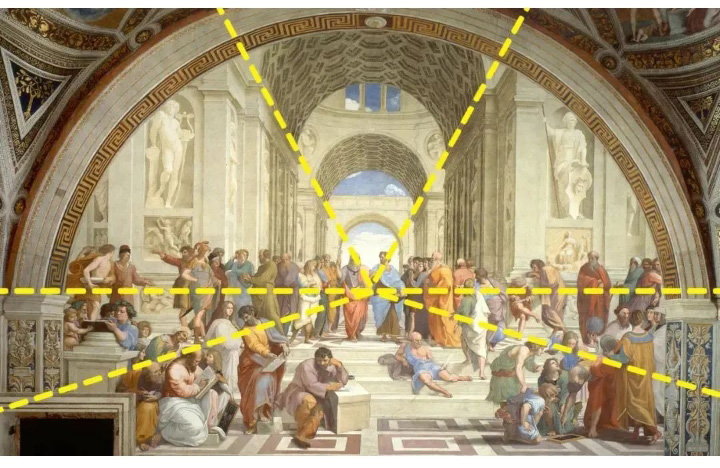 為了突出兩位主角的地位,拉斐爾不光將他們放在了視覺(jué)中心,還在二人身后設(shè)置了一個(gè)拱門,來(lái)強(qiáng)化畫(huà)面的焦點(diǎn)。