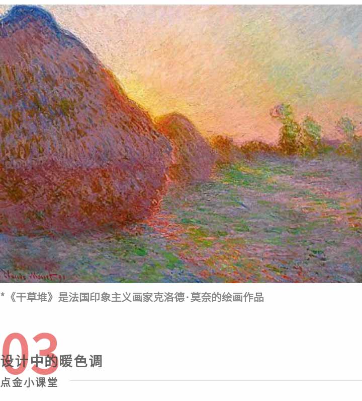 《干草堆》系列大多是暖色調(diào)的畫作,也是莫奈最為大眾傳頌的畫作之一。