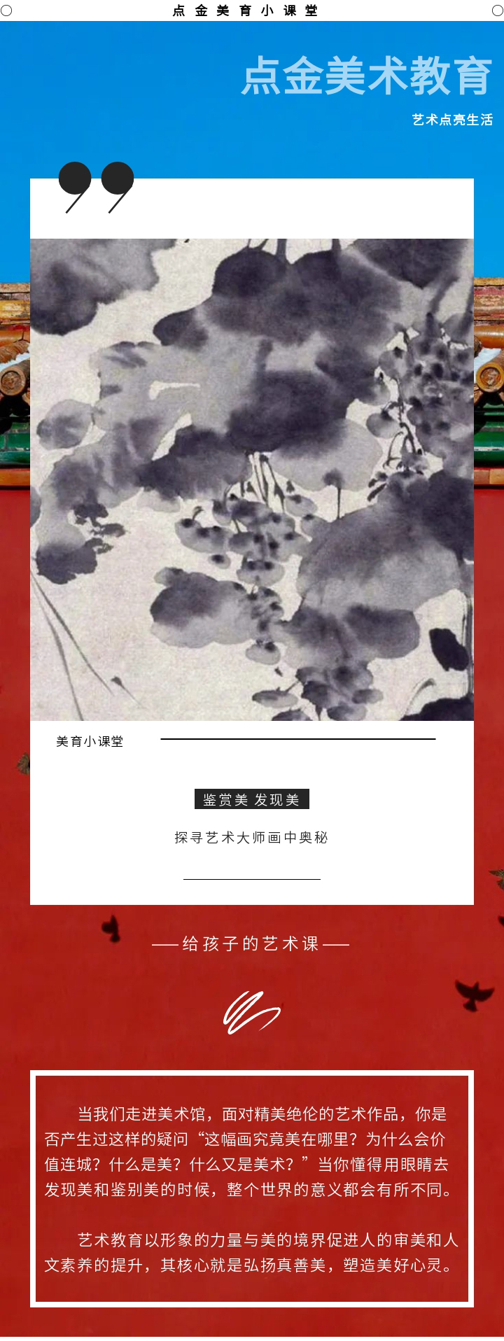 在【點金美術(shù)官方服務(wù)號】的日常更新中,加入名畫的作品介紹和欣賞的內(nèi)容,貼合校內(nèi)美育教育,以此全面發(fā)展學(xué)生的美術(shù)核心素養(yǎng)。