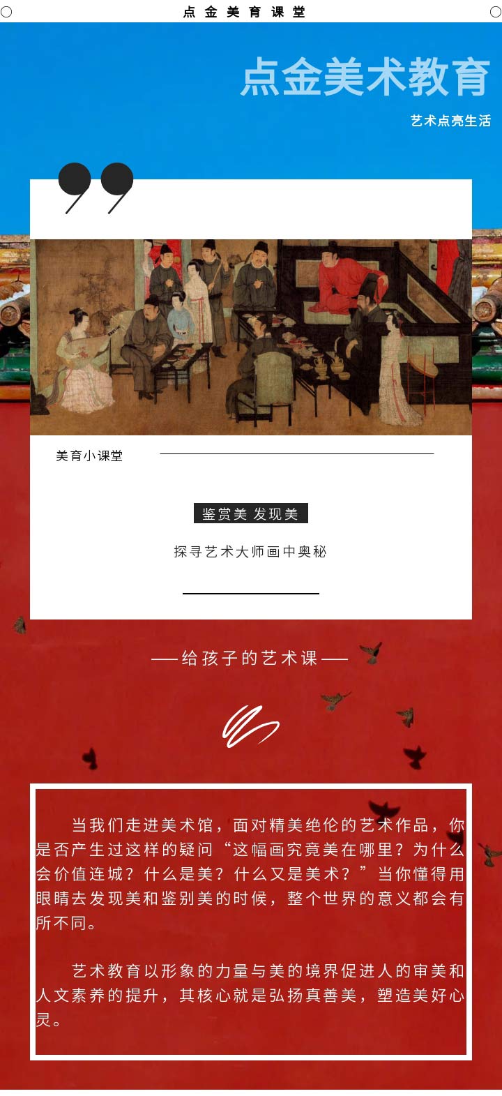 在【點(diǎn)金美術(shù)官方服務(wù)號(hào)】的日常更新中,加入名畫的作品介紹和欣賞的內(nèi)容,貼合校內(nèi)美育教育,以此全面發(fā)展學(xué)生的美術(shù)核心素養(yǎng)。