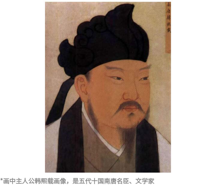 畫中所描繪的韓熙載出身貴族,在動(dòng)蕩社會(huì)下,他看透官場(chǎng)的嚴(yán)峻形勢(shì),逃避做宰相,以聲色為韜晦之略,夜夜笙歌與家中,賓客縱情嬉戲。李煜皇帝派顧閎中去韓府一探究竟,并繪制出來(lái)。顧閎中憑著所觀察到的景象,加上自己的想象力,再現(xiàn)了一幅賓客滿堂的的圖畫。