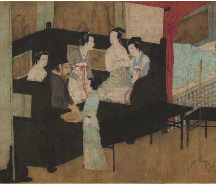 三段“暫歇”,韓熙載與家伎們坐床上休息,正在凈手。