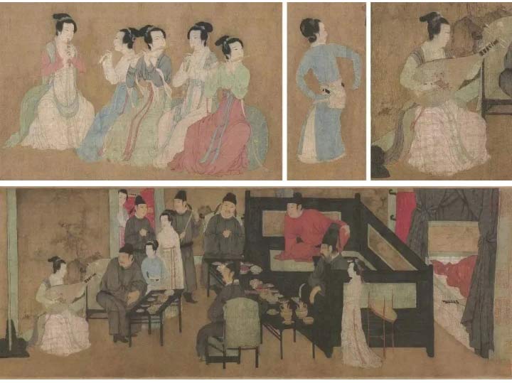 首段“聽(tīng)樂(lè)”,韓熙載與狀元郎粲坐床榻上,正傾聽(tīng)教坊副使李家明之妹彈琵琶,旁坐其兄,在場(chǎng)聽(tīng)樂(lè)賓客還有紫微朱銑、太常博士陳致雍、門生舒雅、家伎王屋山諸人。