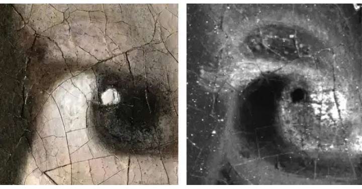 作品對人物刻畫細致。通過掃描技術(shù),研究人員還發(fā)現(xiàn)少女右眼其實是有睫毛的,只是由于年代久遠和背景融為一體。將畫面放大140倍之后,在少女的下嘴唇右側(cè),還可以看到兩根當(dāng)年從維米爾畫筆上脫落的刷毛纖維。