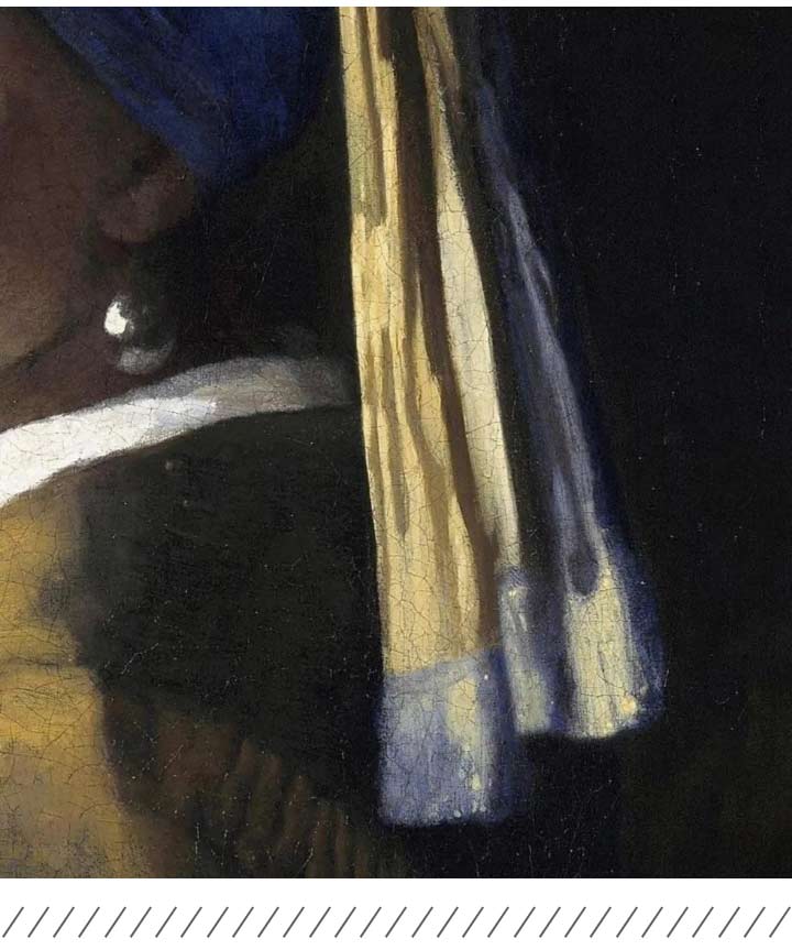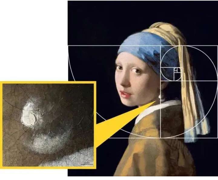 畫面另一個令人矚目之處,在于少女左耳佩戴的一只珍珠耳環(huán),在少女頸部的陰影里似隱似現(xiàn),它被安排在了黃金分割點上,讓畫面擁有了和諧穩(wěn)定的美感。