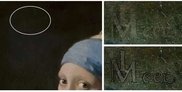 在深度背景的映襯下,少女仿佛從暗處以光彩十足的凜然姿態(tài)出現(xiàn),研究者還發(fā)現(xiàn)了維米爾消失的簽名。簽名原本位于畫面左上角,可惜隨著背景的褪色一同消失了。