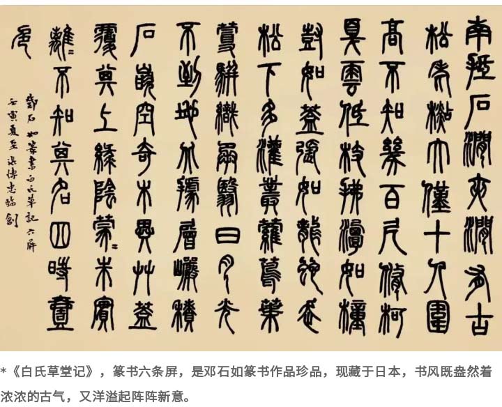 鄧石如是清代篆書大家,他突破了書家信奉的“二李”(李斯、李陽冰)模式,字有新意,既體現(xiàn)篆書線條的流暢特點(diǎn),又有渾厚造型,解決了過去篆書書寫上過于工藝化的特點(diǎn),他的篆書代表作品是《白氏草堂記》。