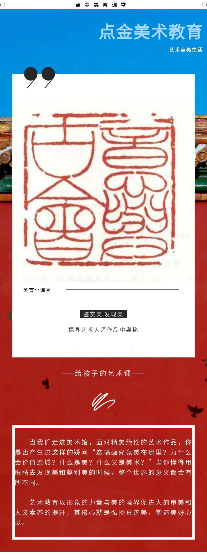 在【點(diǎn)金美術(shù)官方服務(wù)號】的日常更新中,加入名作的作品介紹和欣賞的內(nèi)容,貼合校內(nèi)美育教育,以此全面發(fā)展學(xué)生的美術(shù)核心素養(yǎng)。