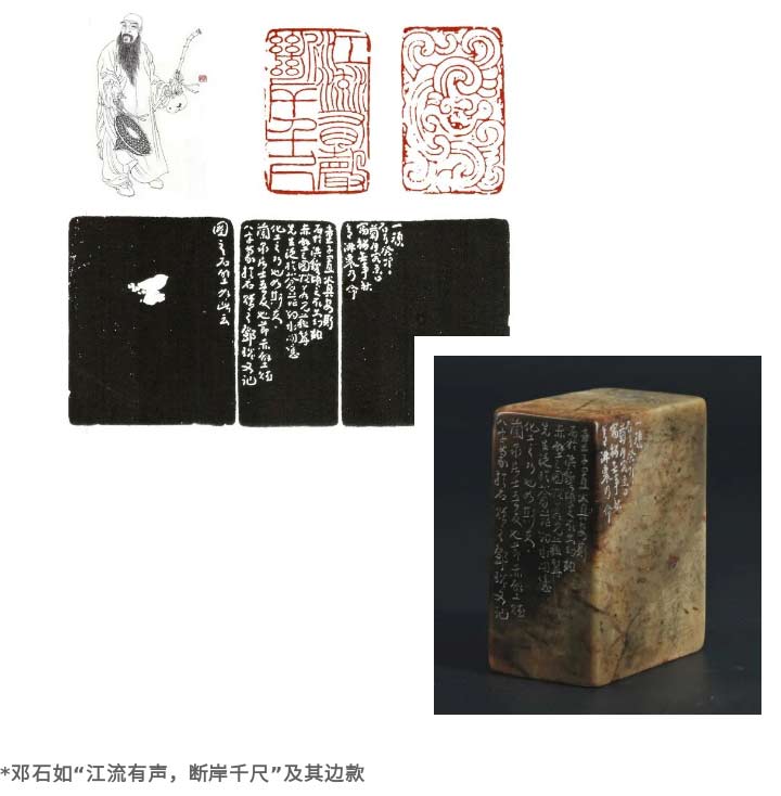 鄧石如篆刻造詣也是一絕,他是小篆系統(tǒng)入印的集大成者。西泠印社社址照理是崇奉浙派領(lǐng)袖的,偏偏鄧石如的石像和浙派八家之首丁敬石像豎立在一起,鄧石如篆刻直接或間接影響了眾多晚清、民國年間的篆刻家。