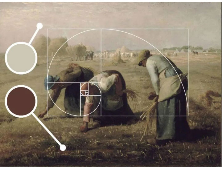 在構(gòu)圖上,米勒采用了黃金分割率對畫面進行整體安排,紅頭巾的農(nóng)婦是整幅畫的黃金分割點,藍頭巾的農(nóng)婦是紅頭巾的農(nóng)婦與畫面左邊邊界的黃金分割點,而黃色頭巾的農(nóng)婦又是紅頭巾的農(nóng)婦與畫面右邊邊界的黃金分割點。畫面三個主人公均處于畫面的黃金分割點位置,使畫面和諧均衡,體現(xiàn)了米勒精心巧妙的構(gòu)圖設計。