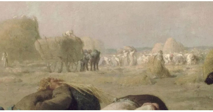 米勒將收割麥子的大部隊放到了遠處,只在近處著重描寫撿麥穗的三人。這樣的處理使人物更加突出,也讓主題更貼近生活。