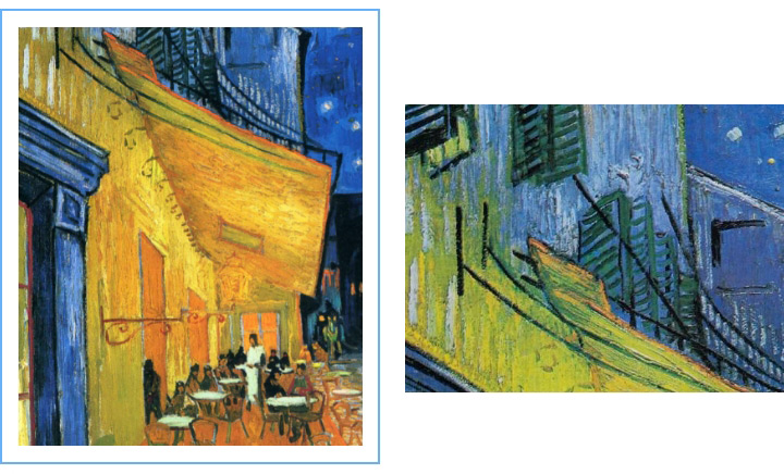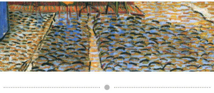 這幅《夜間的露天咖啡座》中的咖啡店,是真實(shí)存在的,在古羅馬廣場上,梵高在《夜間的露天咖啡座》描繪過的咖啡館,現(xiàn)在已更名梵高咖啡館,這家咖啡館一直是阿爾勒的人們飲酒的地方,仍舊保留著那黃色的雨蓬和所有的東西。