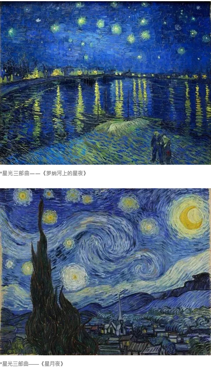 梵高的【星光三部曲】舉世聞名,而《夜間的露天咖啡座》則是是梵高星光三部曲的第一部,畫面描繪了阿爾勒一家咖啡館的室外景色,室內(nèi)溫暖而明亮的黃色燈光灑在屋外鵝卵石鋪成的廣場上,在深藍(lán)色的夜空中,群星閃爍,宛如朵朵燦爛的燈花。