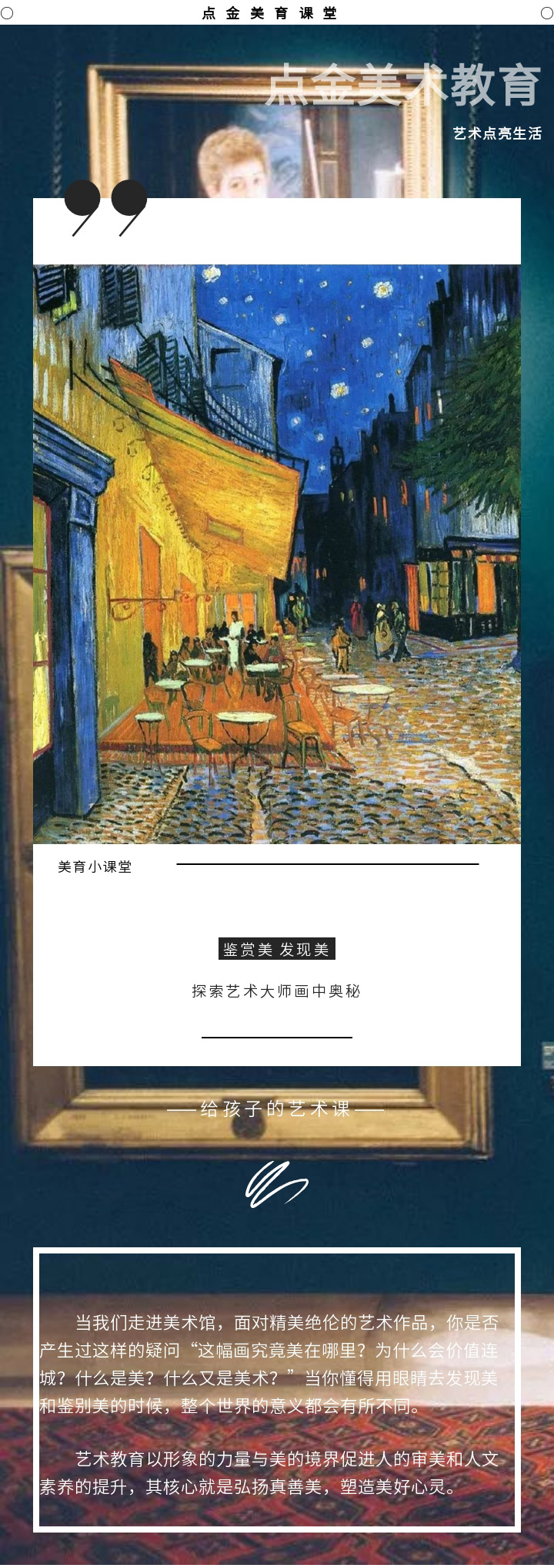 在【點(diǎn)金美術(shù)官方服務(wù)號】的日常更新中,加入名畫的作品介紹和欣賞的內(nèi)容,貼合校內(nèi)美育教育,以此全面發(fā)展學(xué)生的美術(shù)核心素養(yǎng)。