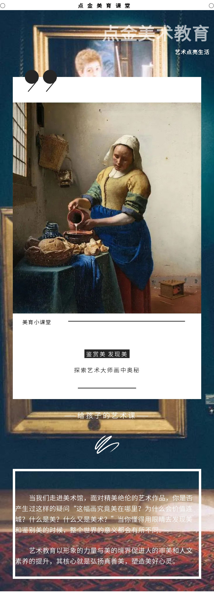 在【點金美術官方服務號】的日常更新中,加入名畫的作品介紹和欣賞的內(nèi)容,貼合校內(nèi)美育教育,以此全面發(fā)展學生的美術核心素養(yǎng)。