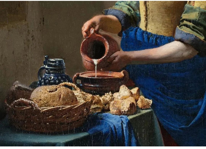 這幅《倒牛奶的女傭人》的畫幅并不大,畫它的時候維米爾才25歲左右,他捕捉到了廚房的女仆履行日常職責時的狀態(tài),女傭正在將一個陶瓷罐子里的牛奶倒入另一個瓷器鍋里。