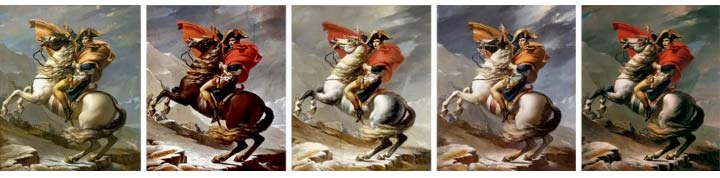 收到第一版畫后,拿破侖下令再畫三個(gè)版本,畫完這四版并成功交付之后,大衛(wèi)又單獨(dú)畫了一幅留給自己收藏,也就是《跨越阿爾卑斯山圣伯納隘道的拿破侖》的第五版。第五版與原版相似度最高,都是橙色披風(fēng)以及黑白花斑的馬,可能這才是畫家自己最滿意的搭配。