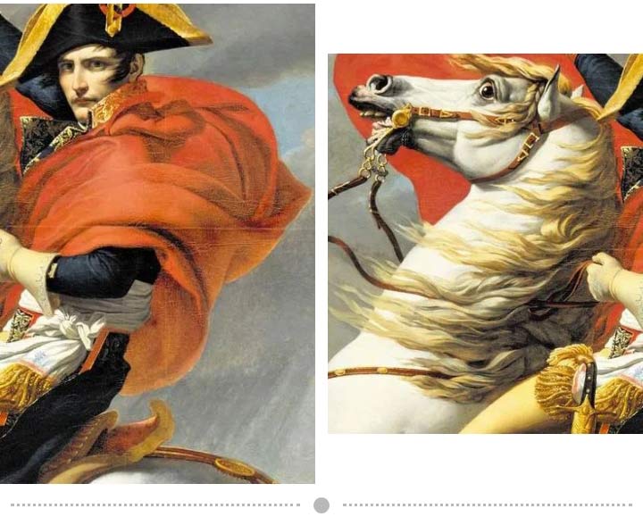 大衛(wèi)的作品中總是少不了對(duì)人物姿勢(shì)細(xì)節(jié)的描繪。畫中,從拿破侖背后吹來的峻烈的山風(fēng)使得他的披風(fēng)都高高揚(yáng)起,宛若古典時(shí)代的神話英雄,就連逆風(fēng)而飛揚(yáng)的馬鬃也被畫家一絲不茍地描繪了出來。