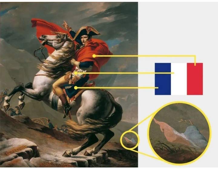 畫面中主要有三種顏色最為突出,即拿破侖身上的斗篷、白馬以及深沉的天空。斗篷非常鮮艷奪目,與天空形成了強(qiáng)烈的對(duì)比。這種對(duì)比色的運(yùn)用營造出了戲劇性的效果,使畫面更加引人入勝,也讓拿破侖的形象在畫面中更加鮮明。