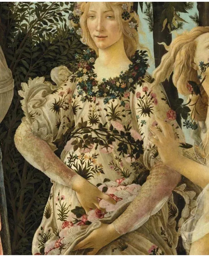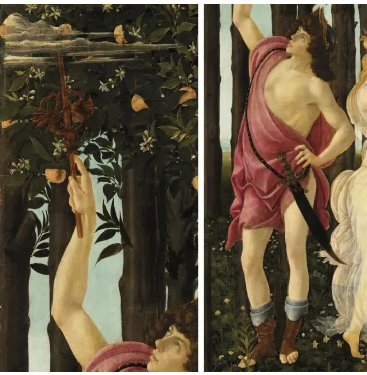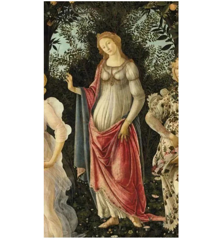畫幅的最左邊是為這一行人開路的眾神使者赫爾美斯,他用權(quán)杖點觸著大地,點到之處,樹枝吐芽,花朵綻放,春回大地。
