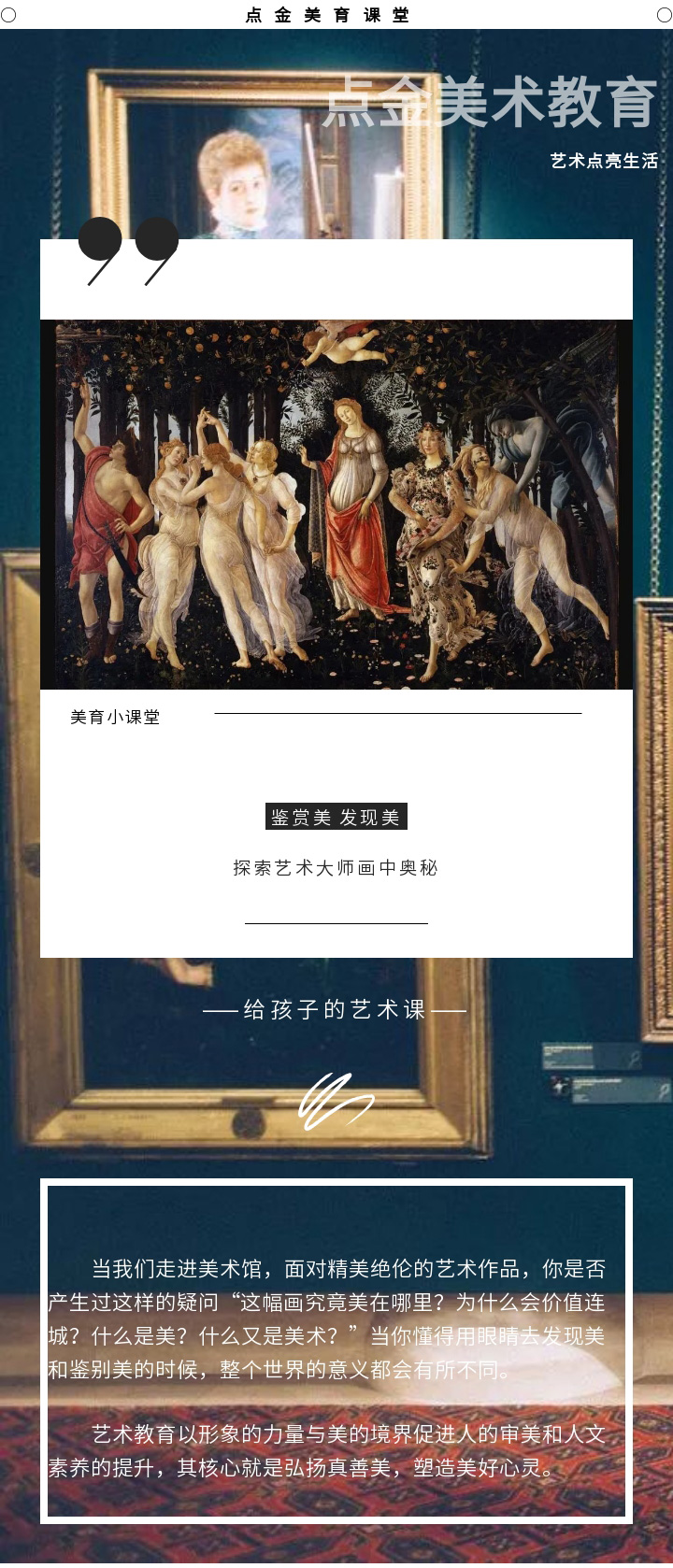 在【點金美術(shù)官方服務(wù)號】的日常更新中,加入名畫的作品介紹和欣賞的內(nèi)容,貼合校內(nèi)美育教育,以此全面發(fā)展學(xué)生的美術(shù)核心素養(yǎng)。