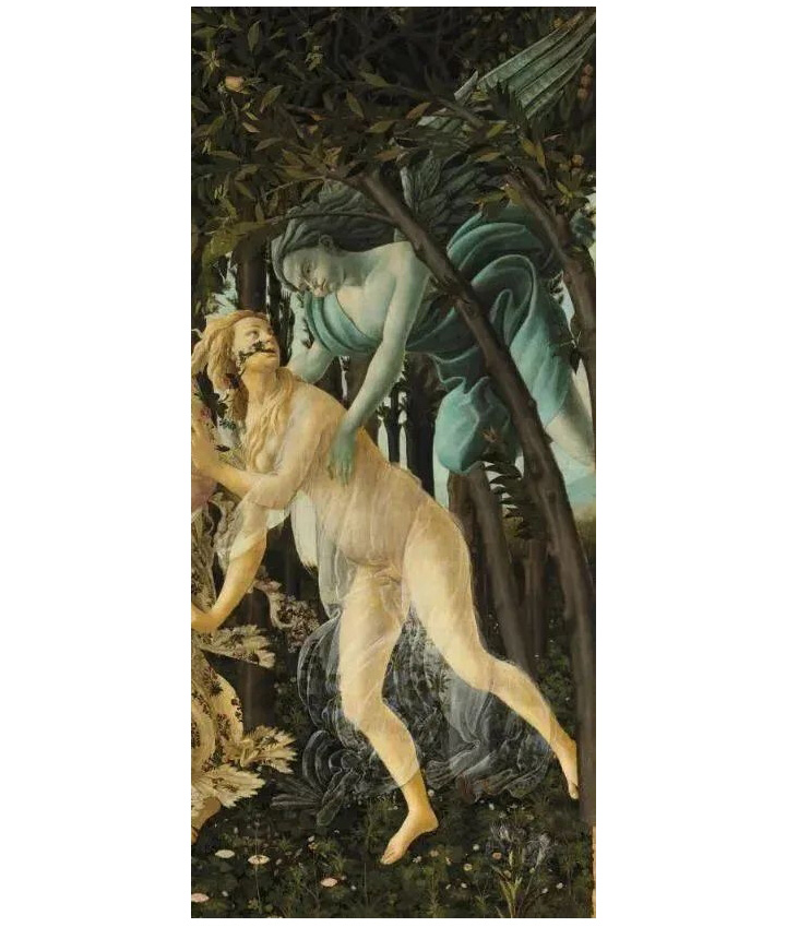 畫幅最右邊的是代表冬天的風(fēng)神,他正把口吐花朵的花神從林中推出,預(yù)示著冬去春來百花盛開。