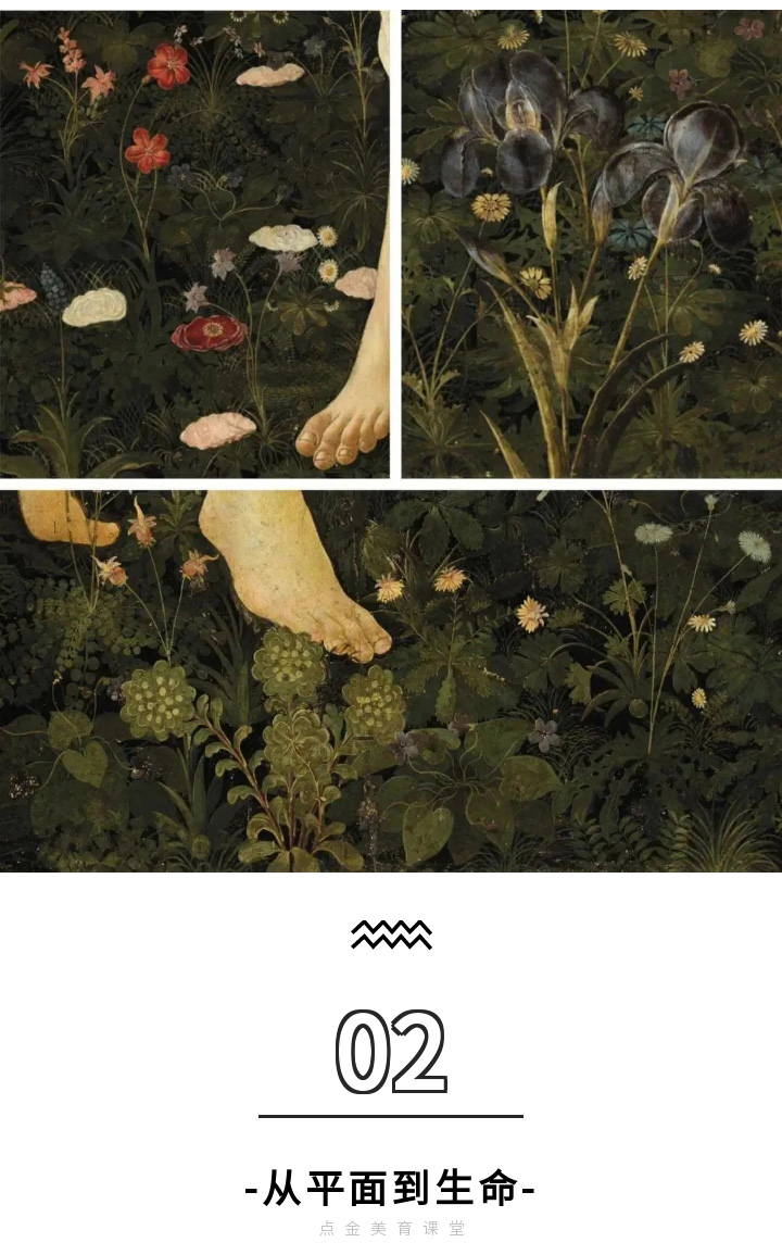 在畫面底部,描繪了非常精致的鮮花草地,涵蓋了各個季節(jié)的花卉,甚至有學(xué)者專門從植物角度去研究這幅畫。
